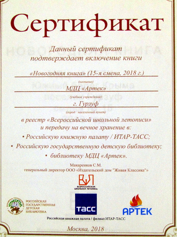 Эта книга включена в реестр «Всероссийской школьной летописи» и передана на вечное хранение в Российскую книжную палату ИТР-ТАСС, Российскую государственную детскую библиотеку, и в библиотеку МДЦ «Артек».